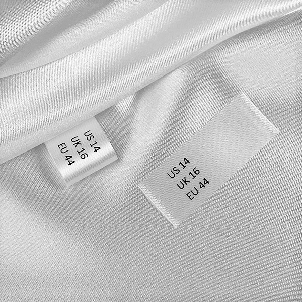 Size label made of satin roll printed and cut to the preferred dimensions, for sewing on clothes or clothing accessories. This type of textile label is made using the most advanced technologies in the digital printing field on a textile support. The labels are printed on a special satin by thermal transfer method, with an impressive print quality and high wash resistance.