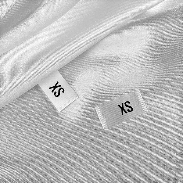 Textile labels with the size or number of the product to which will be sewn, made of white satin printed with black writing. This type of textile label is made using the most advanced technologies in the digital printing field on a textile support. The labels are printed on a special satin by thermal transfer method, with an impressive print quality and high wash resistance.