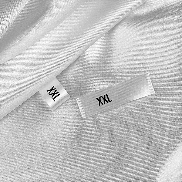 Size label for sewing in a folded shape on a garment, made of fine white textile material. This type of textile label is made using the most advanced technologies in the digital printing field on a textile support. The labels are printed on a special satin by thermal transfer method, with an impressive print quality and high wash resistance.