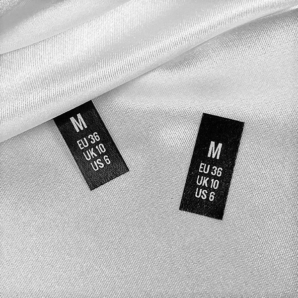 Customized labels with sizes, for sewing on clothes or various clothing items, made to order from high quality textile material. This type of textile label is made using the most advanced technologies in the digital printing field on a textile support. The labels are printed on a special satin by thermal transfer method, with an impressive print quality and high wash resistance.