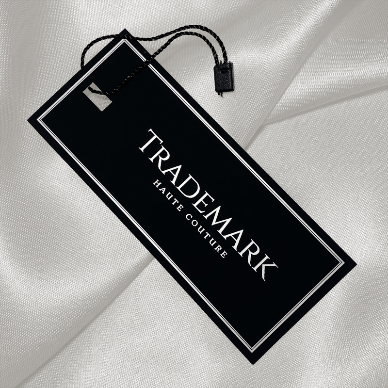 Label for clothing or different types of clothes and shoes, made by laminated cardboard with Soft Touch foil and personalized with silver folio. This remarkable hang tag is crafted from premium materials, utilizing cutting-edge technology in the realms of digital printing and finishing.