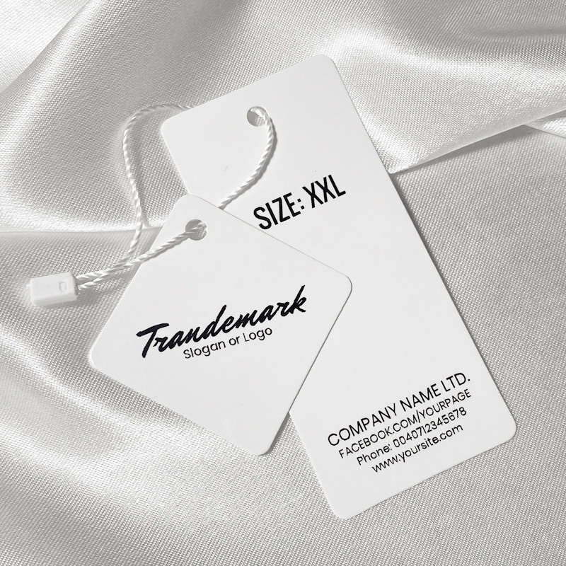 Cardboard labels for clothes with white seal, made of thick laminated cardboard with glossy foil and personalized with text or Brand logo. This remarkable hang tag is crafted from premium materials, utilizing cutting-edge technology in the realms of digital printing and finishing.