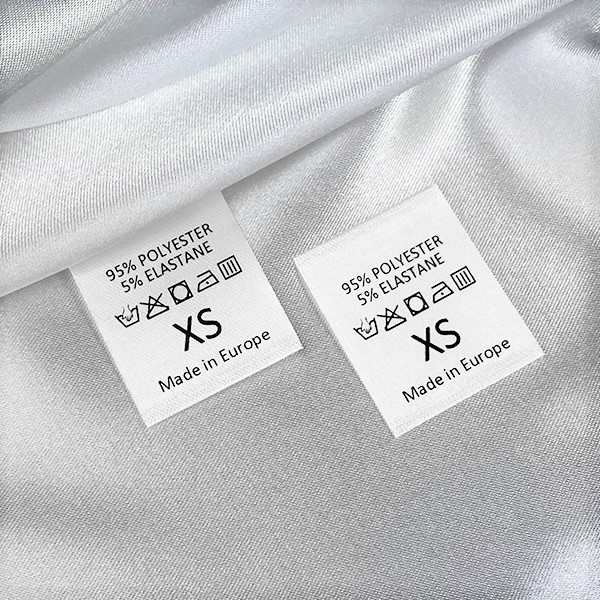 Laundry care label printed on white satin with washing symbols, material composition and size indicator, with ultrasonically cut edges. This type of textile label is produced using advanced digital printing technologies on fabric materials. The labels are crafted from a special satin fabric through the thermal transfer method, ensuring exceptional print quality.