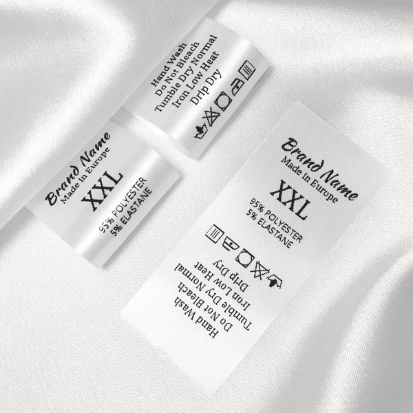 Customized size laundry care label on a fine white satin, suitable for clothes, various clothing and textile products. This type of textile label is produced using advanced digital printing technologies on fabric materials. The labels are crafted from a special satin fabric through the thermal transfer method, ensuring exceptional print quality.