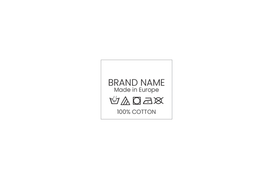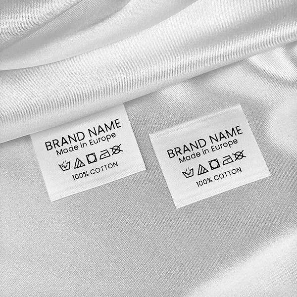 Textile label for clothes and clothing accessories, made of white satin, which contains washing and care symbols, and fabric composition. This type of textile label is made using the most advanced technologies in the digital printing field on a textile support. The labels are printed on a special satin by thermal transfer method, with an impressive print quality and high wash resistance.