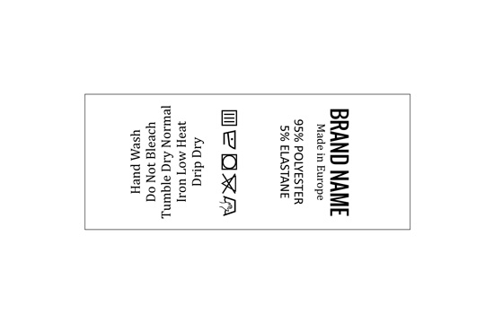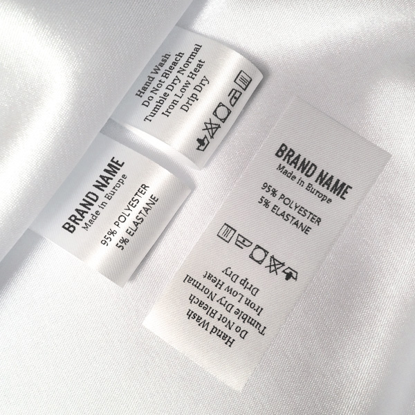 Laundry care label for clothes, customized with Digital printed texts on white satin, suitable for any clothing product. This type of textile label is made using the most advanced technologies in the digital printing field on a textile support. The labels are printed on a special satin by thermal transfer method, with an impressive print quality and high wash resistance.