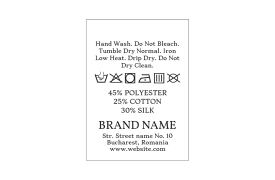 Laundry care label made of fine white satin, customized with manufacturer's name and logo, washing symbols and the type of material used to produce the item to which will be sewn. This type of textile label is made using the most advanced technologies in the digital printing field on a textile support. The labels are printed on a special satin by thermal transfer method, with an impressive print quality and high wash resistance.