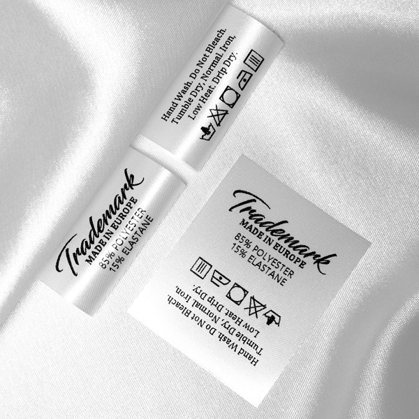 Laundry care label customized with Brand name, laundry symbols and washing instructions, suitable for clothes and clothing accessories. This type of textile label is produced using advanced digital printing technologies on fabric materials. The labels are crafted from a special satin fabric through the thermal transfer method, ensuring exceptional print quality.