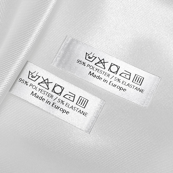 Textile label with washing and maintenance symbols for sewing on clothes, personalized with details about the composition of the material and the country of manufacture. This type of textile label is made using the most advanced technologies in the digital printing field on a textile support. The labels are printed on a special satin by thermal transfer method, with an impressive print quality and high wash resistance.