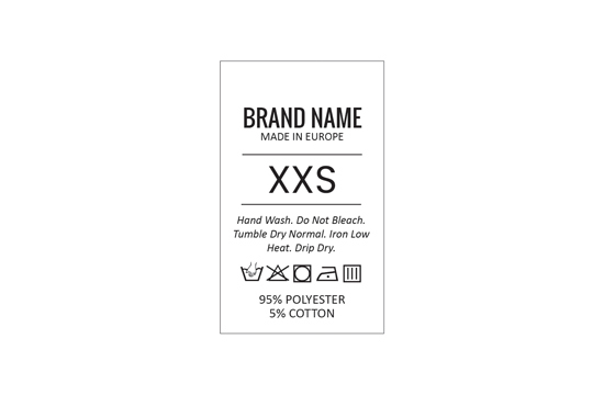 Technical label containing information on the composition of the material, washing, care and maintenance instructions, the name of the manufacturer and the country of manufacture. This type of textile label is made using the most advanced technologies in the digital printing field on a textile support. The labels are printed on a special satin by thermal transfer method, with an impressive print quality and high wash resistance.