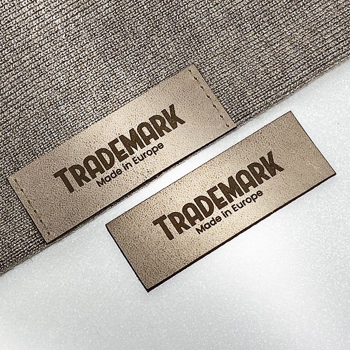 Natural leather label with brand’s name or logo model EP-M56, personalized by laser engraving, suitable for hoodies, jackets, sweaters, hats, scarves, bags and many others. This leather label model is made of high-quality genuine leather, using the latest generation equipment and professional laser engraving or embossing methods.