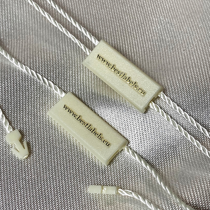 Custom plastic seal tag ST-M125 for fashion products, such as clothes, footwear, bags, jewelry, clothing accessories, etc.