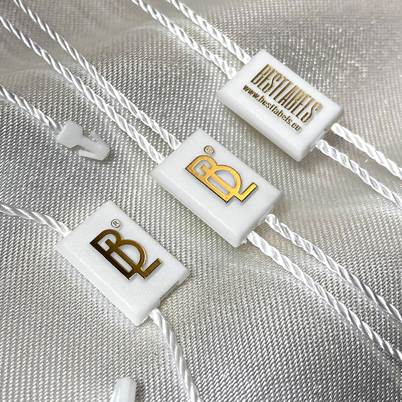Custom plastic seal tag ST-M172 for fashion products, such as clothes, footwear, bags, jewelry, clothing accessories, etc.