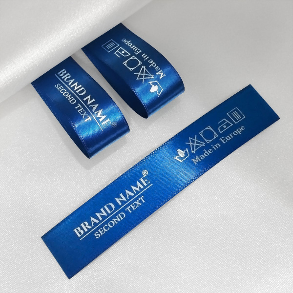 Custom label TL-M82 printed on satin fabric suitable for clothing, clothes accessories, and other textile products.