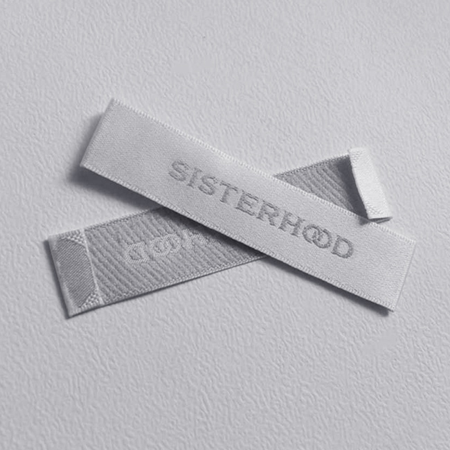 Simple and elegant label with small dimensions digitally embroidered with the Brand name or with a logo, made of textile material in preferential colors. This woven label is crafted from premium materials and utilizes cutting-edge technology from the field of digital embroidery at an industrial scale.