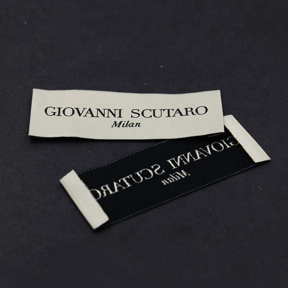 Digital embroidered label on a fabric with folded edges model Pure Style designed to be woven on a garment, customized with a name and logo. This woven label is crafted from premium materials and utilizes cutting-edge technology from the field of digital embroidery at an industrial scale.